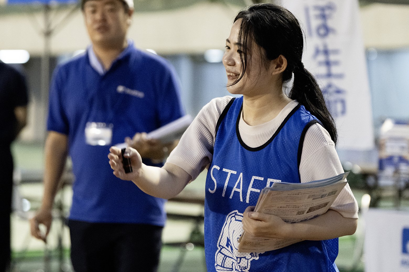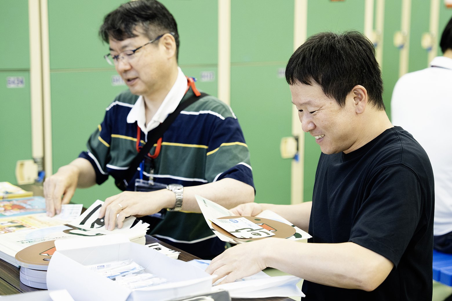 入場誘導を担当する井上さんは、参加者が滞留しやすい入口側のスペースに立ち、声かけと身振り手振りで誘導。尺田さんは、参加者へラジオ体操の情報誌を配付。山口さんは全体を見ながらスタッフに声かけを行います。