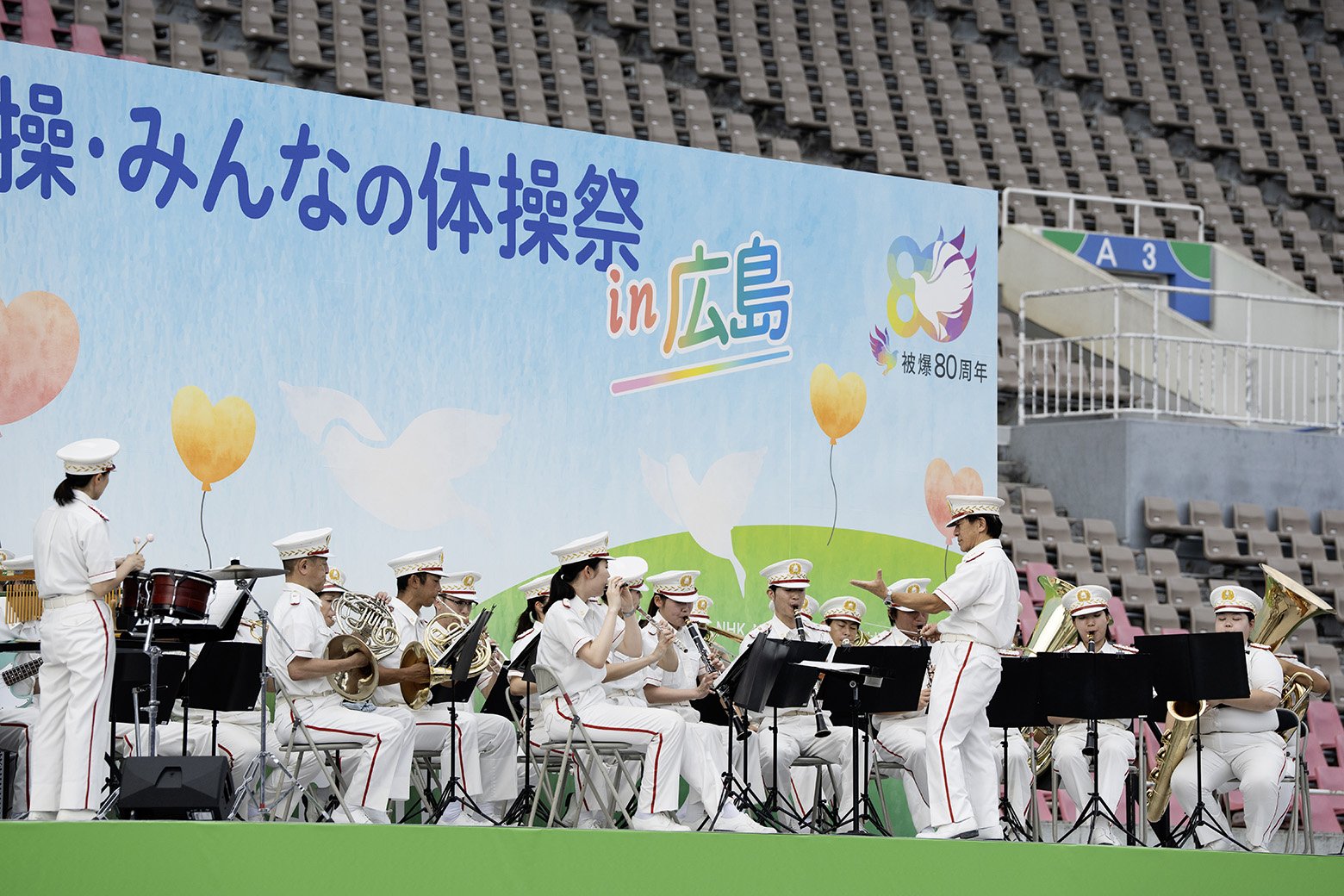 放送終了後には、広島市消防音楽隊による演奏が行われました。心地よく運動した後、芝生の上に座り、美しい音色に耳を澄ます参加者の皆さん。『上を向いて歩こう』が流れてくると、自然と手拍子が起きます。