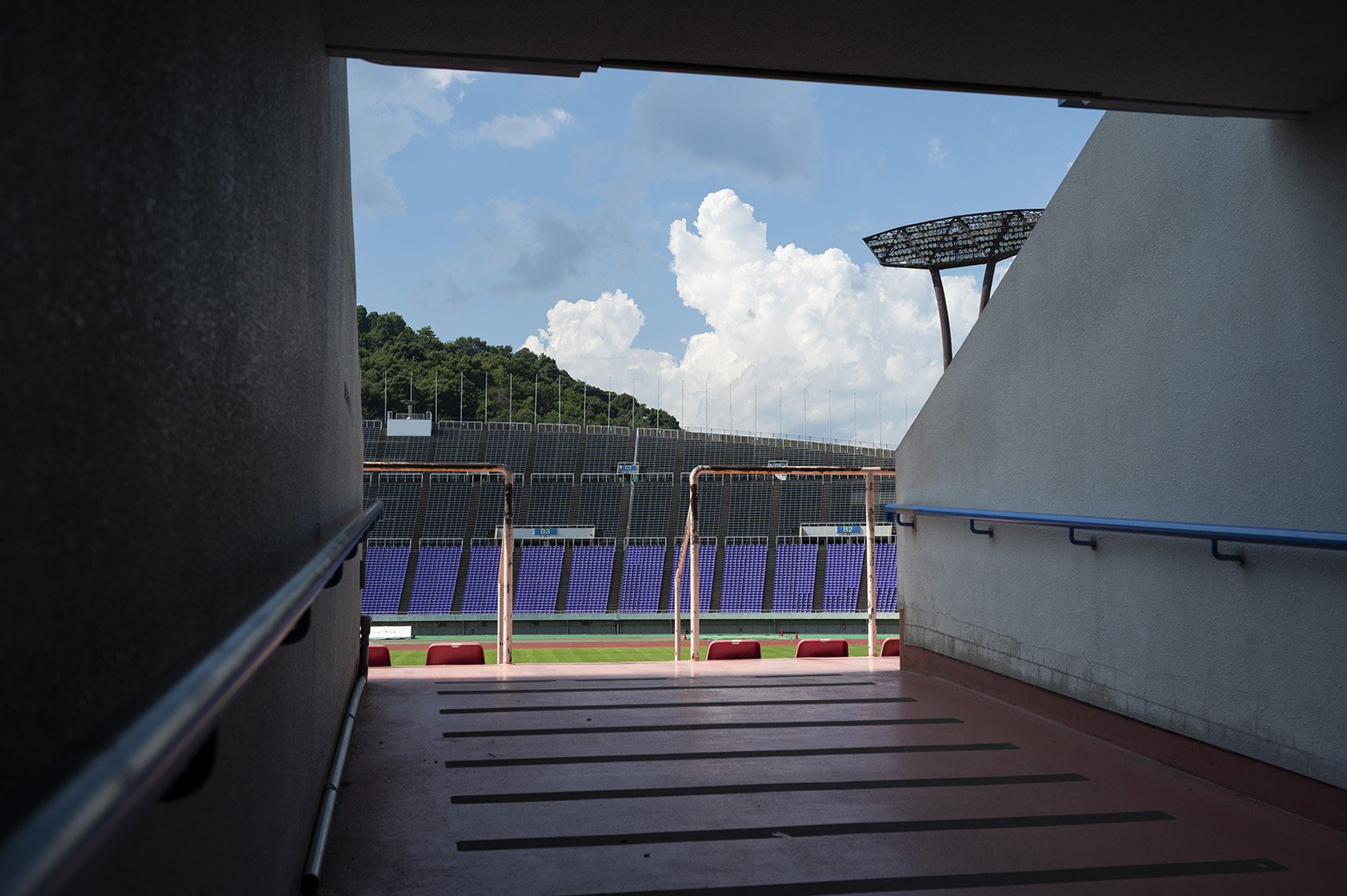 この日は雲一つない青空の真夏日。収容人数50,000人のスタジアムは音もなく、静寂が包んでいます。