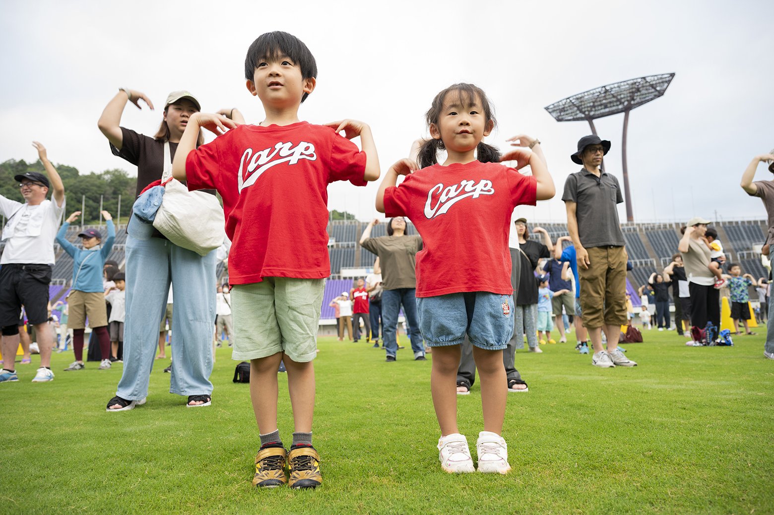 音楽に合わせて「イチ、ニ、サン」と声を出し、ジャンプ運動では「ひろしまけん・ひろしまし・ひろしまし」と繰り返す「広島ジャンプ」を披露。会場全体に一体感が生まれつつあります。