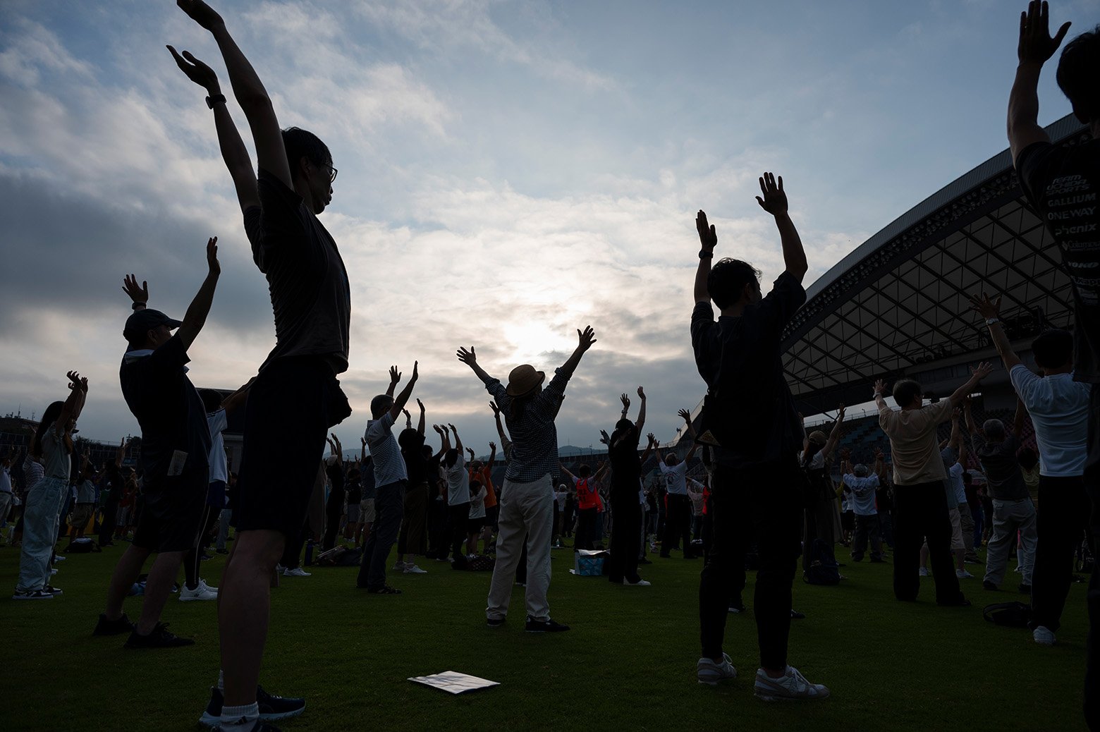 真っ暗だった空が徐々に白み始め、参加者が次々に入場していきます。