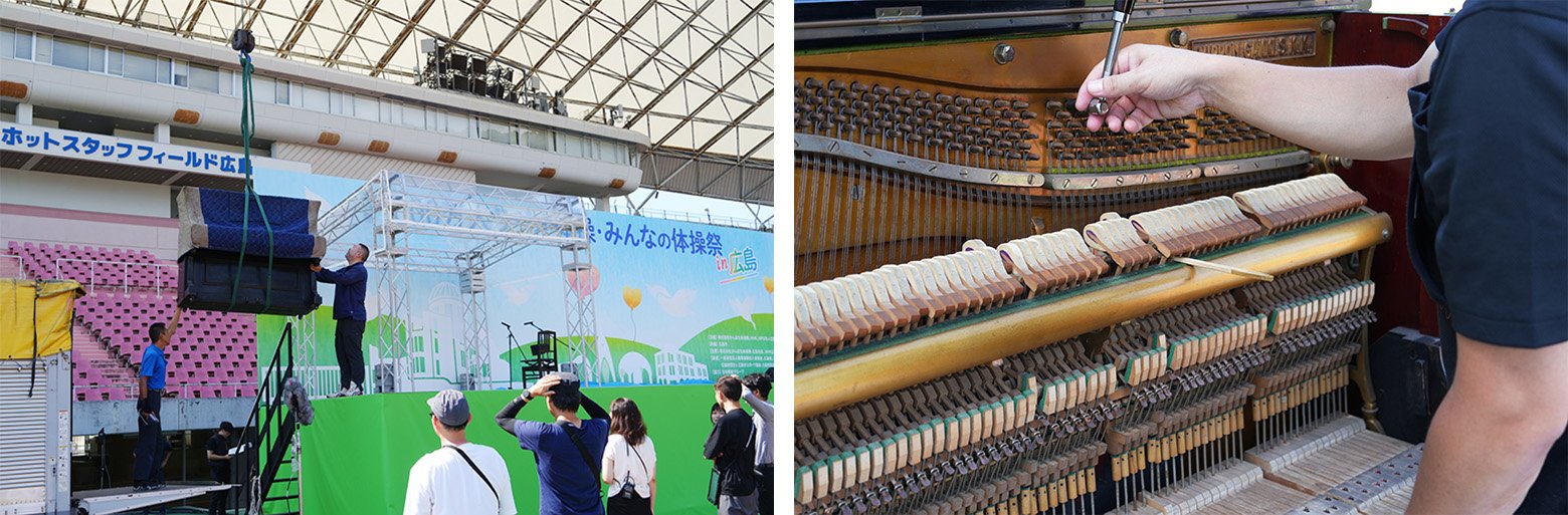 ここでピアノが搬入され、調律がスタート。伴奏に使われるのは、爆心地から約1.5kmの民家で被爆した「被爆ピアノ」。ガラス片が刺さった傷跡が生々しく残ります。