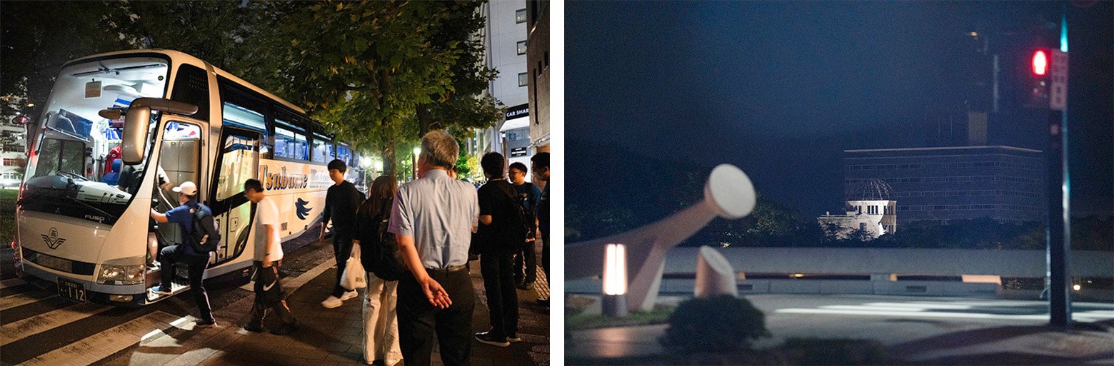 静まり返る平和記念公園のそばから、社員スタッフは大型バス2台で会場へ。