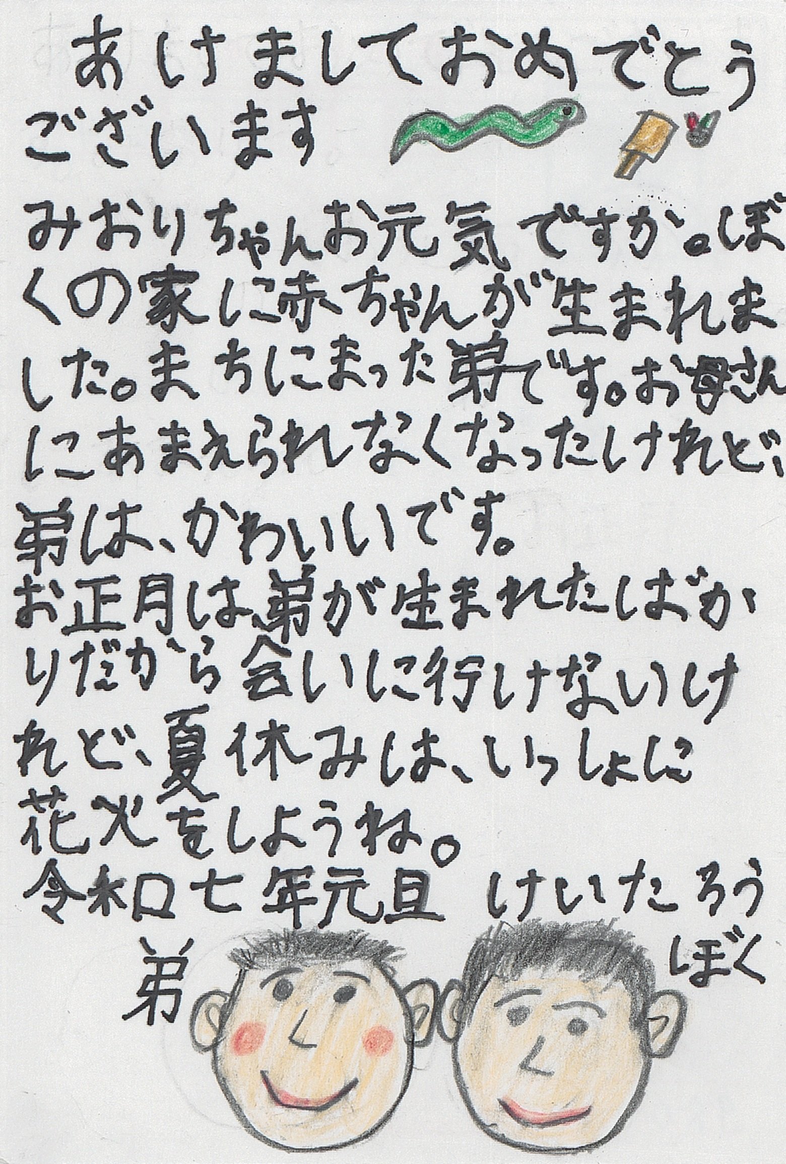 山尾:ことば部門の年賀状大賞に選ばれた湊さんの作品は、一つひとつの文から弟が誕生した喜びが伝わってきます。特に「お母さんにあまえられなくなった」という言葉から、お兄ちゃんとしての心情の変化が感じられます。これからも甘えていいんだよ、と伝えてあげたいです。
