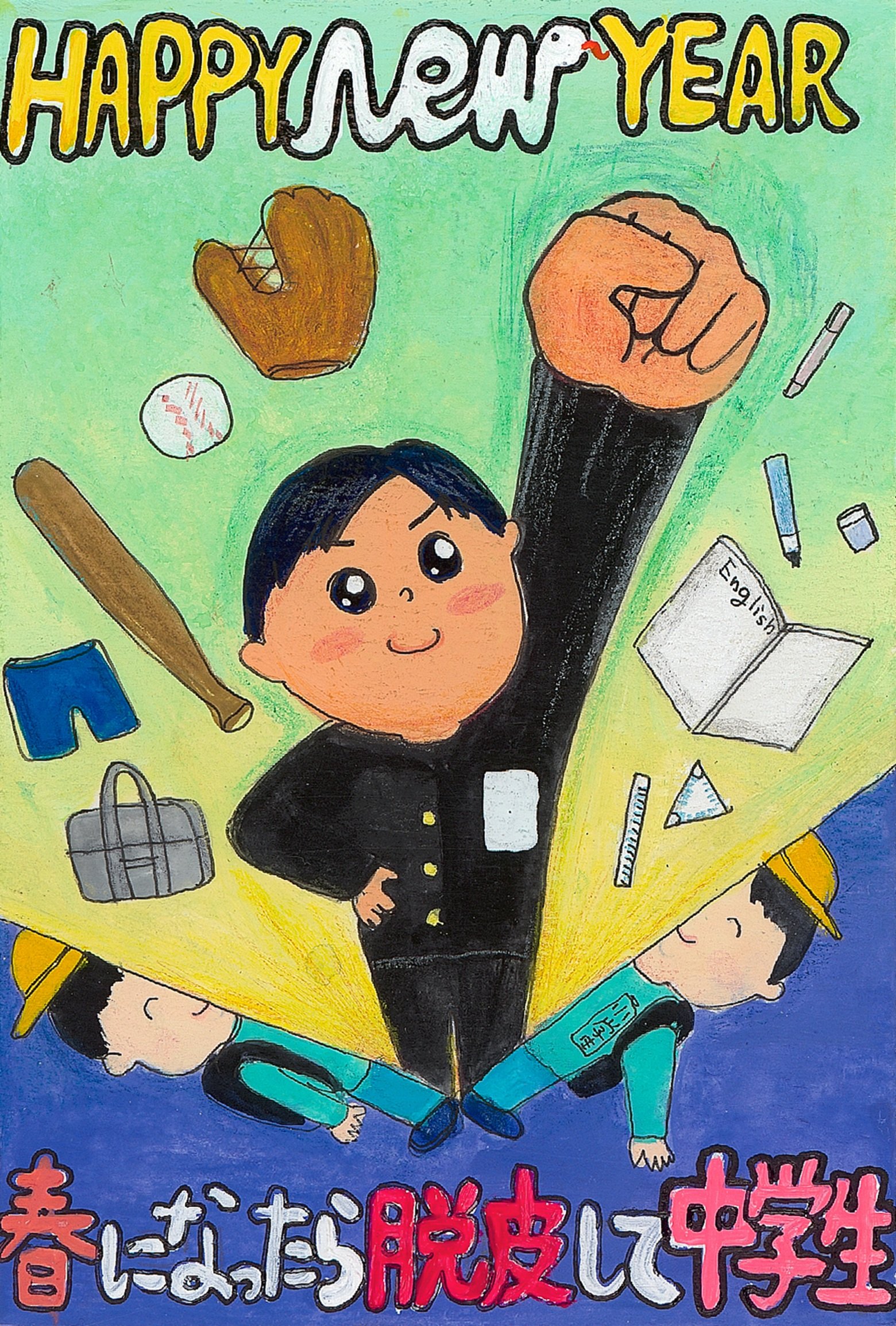 山尾:絵手紙部門で文部科学大臣賞を受賞した永井さんの作品が印象深かったです。春から中学生になる意気込みを巳年にかけて「脱皮」と表現しているのが、年賀状ならではの伝え方だと思いました。イラストからも英語や野球を頑張りたい気持ちが感じられます。