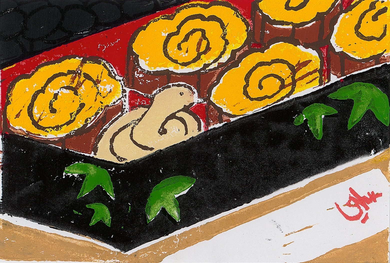 江口:版画部門で文部科学大臣賞を受賞した村井さんの作品です。おせちの伊達巻きととぐろ巻いている白ヘビの作品で、とてもおもしろく印象に残りました。この年賀状は、毎年おせち料理を作ってくれる親族にあてたものなので、描かれた背景を知るとより一層ユーモアが伝わってきます。