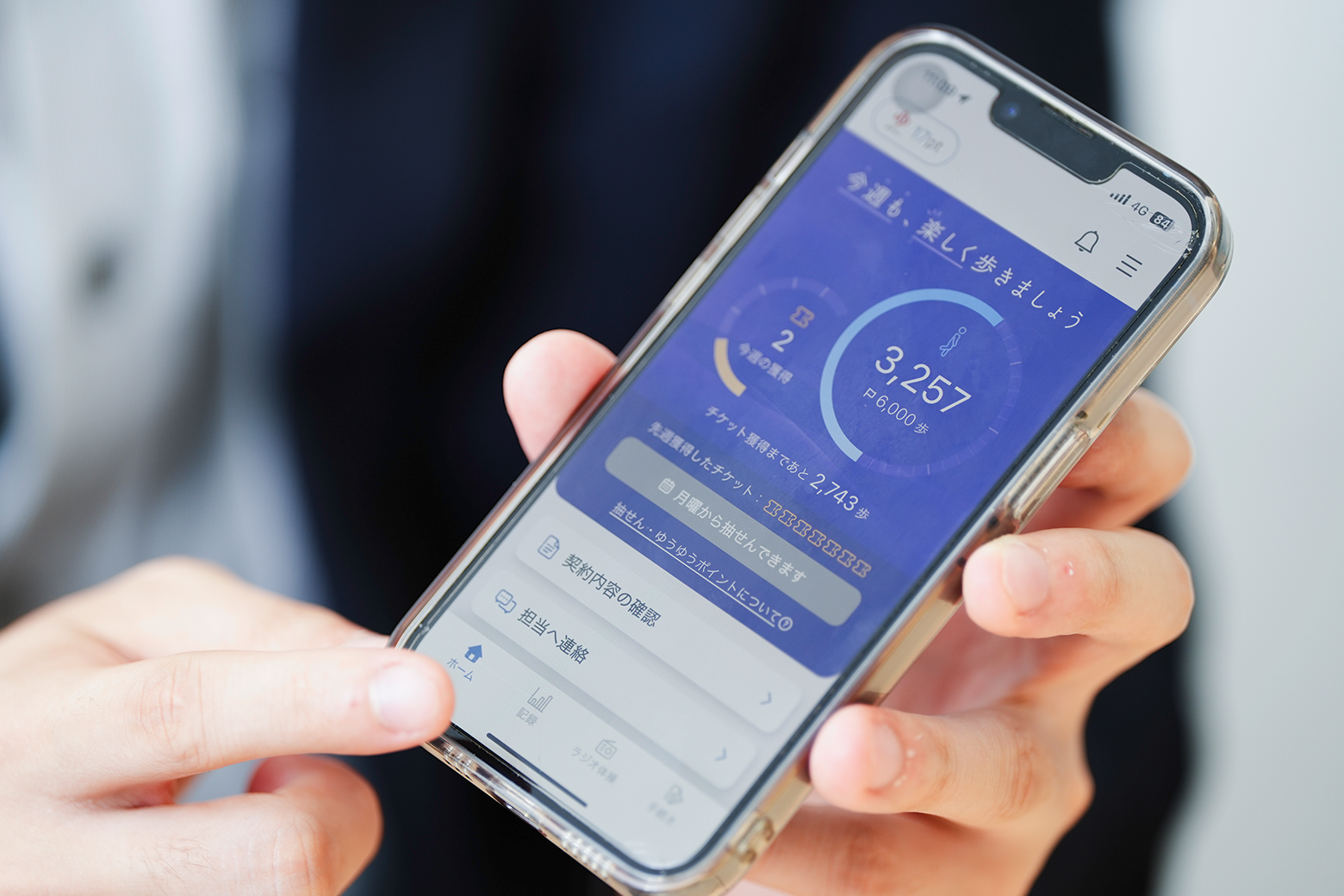 松山:従来の「すこやかんぽ」アプリにも搭載されていた、「歩数計測」「ラジオ体操」の機能はほぼそのまま受け継いでおり、どなたでもご利用いただけます。そのうえで、今回のリニューアルでは「お客さまとつながる」ことを実現するために、ご契約者さまへのアフターフォロー機能を強化しています。
