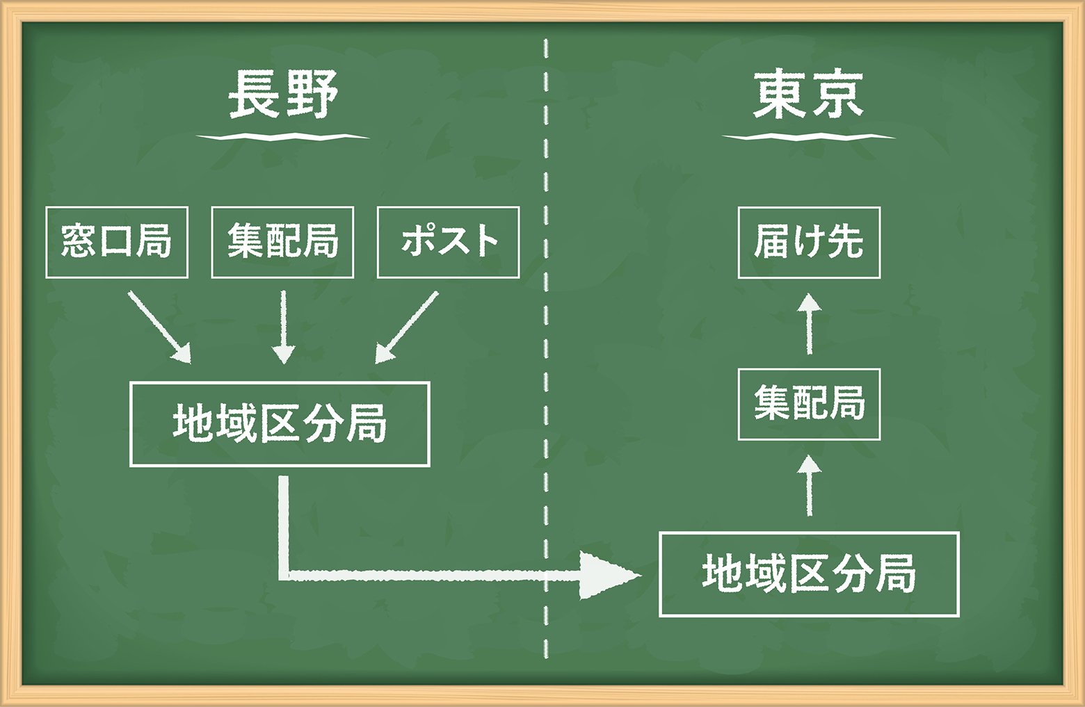 今回の物語で例えると、長野県の集配局で預けられたゆうパックは、県内の地域区分局へ集められます。そこから都内の地域区分局へ運ばれ、地域区分局から孫が住むエリアの集配局に運ばれて、孫の家に配達されます。