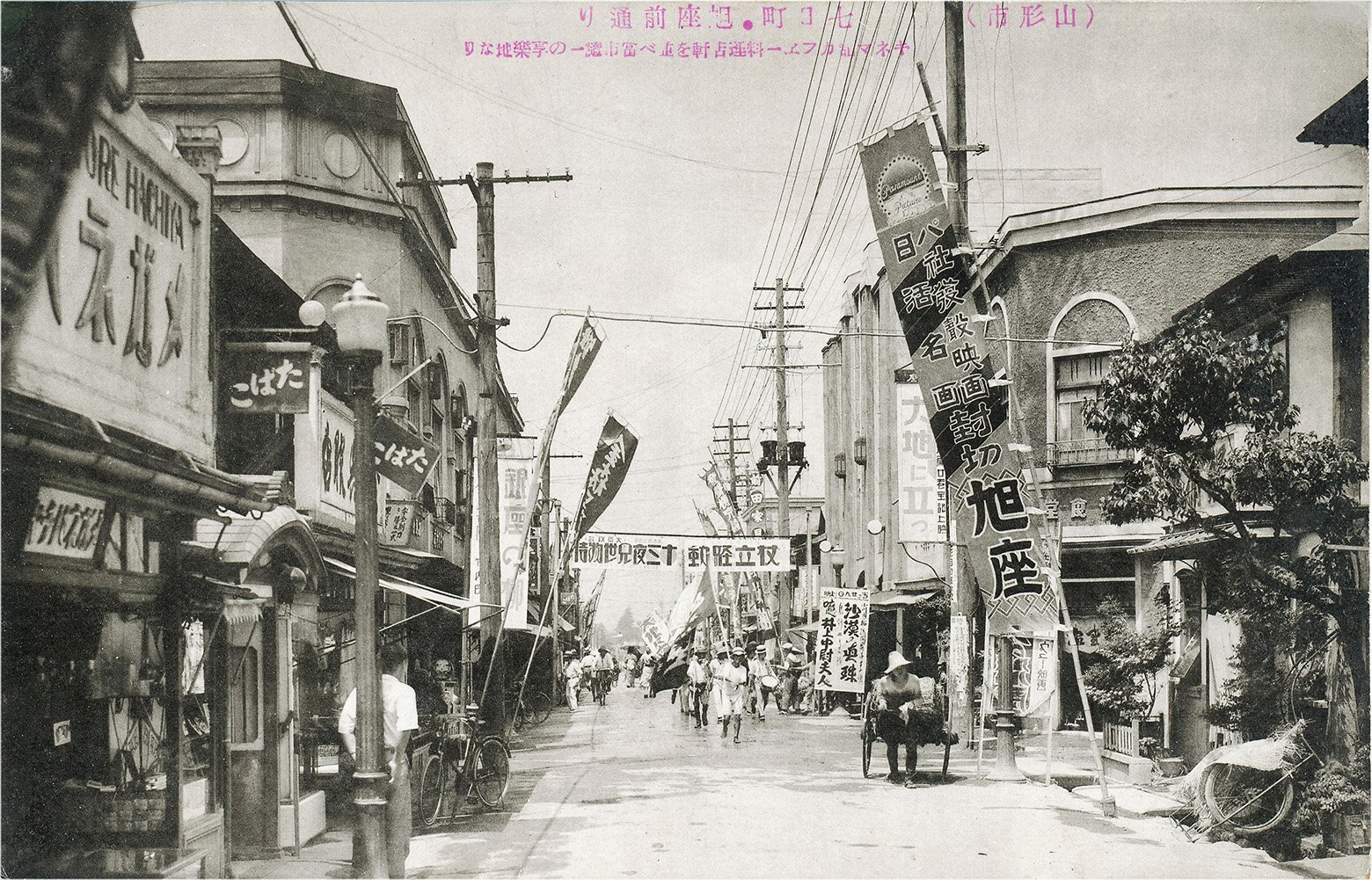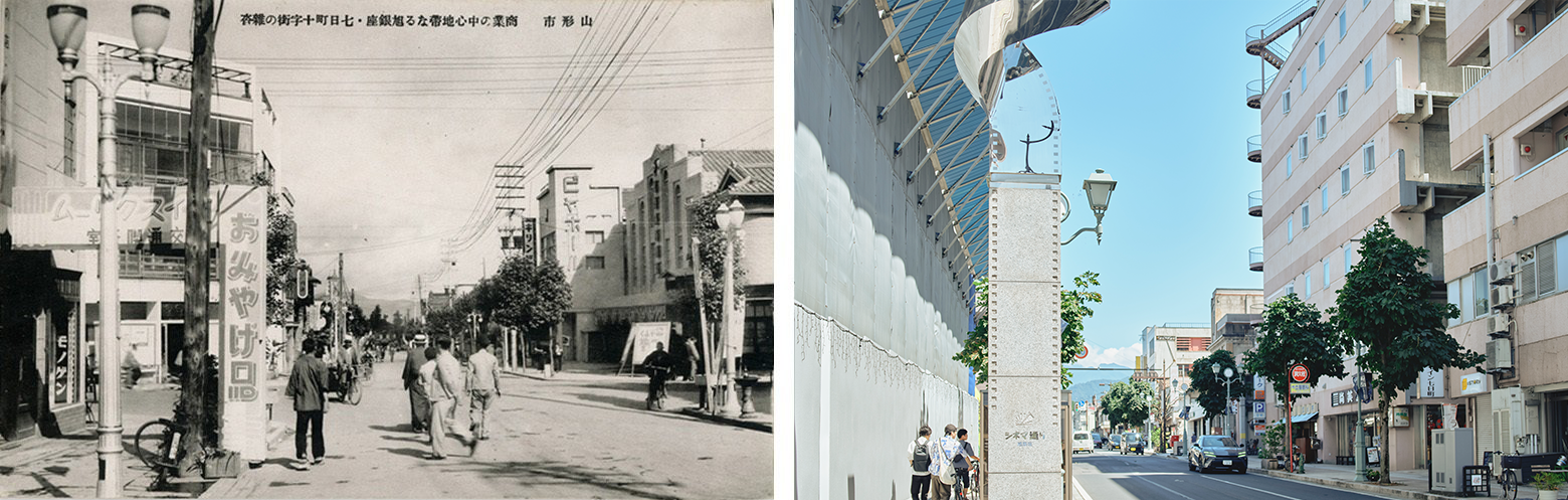 郵便局がある七日町(なぬかまち)は、山形市を代表する繁華街の一つ。かつては郵便局の近隣に7軒の映画館があったそうだ。その中心にあったのは「旭座」という、戦前から営業していた芝居小屋・映画館で、商店会の名称「旭銀座のれん会」の由来にもなっている。