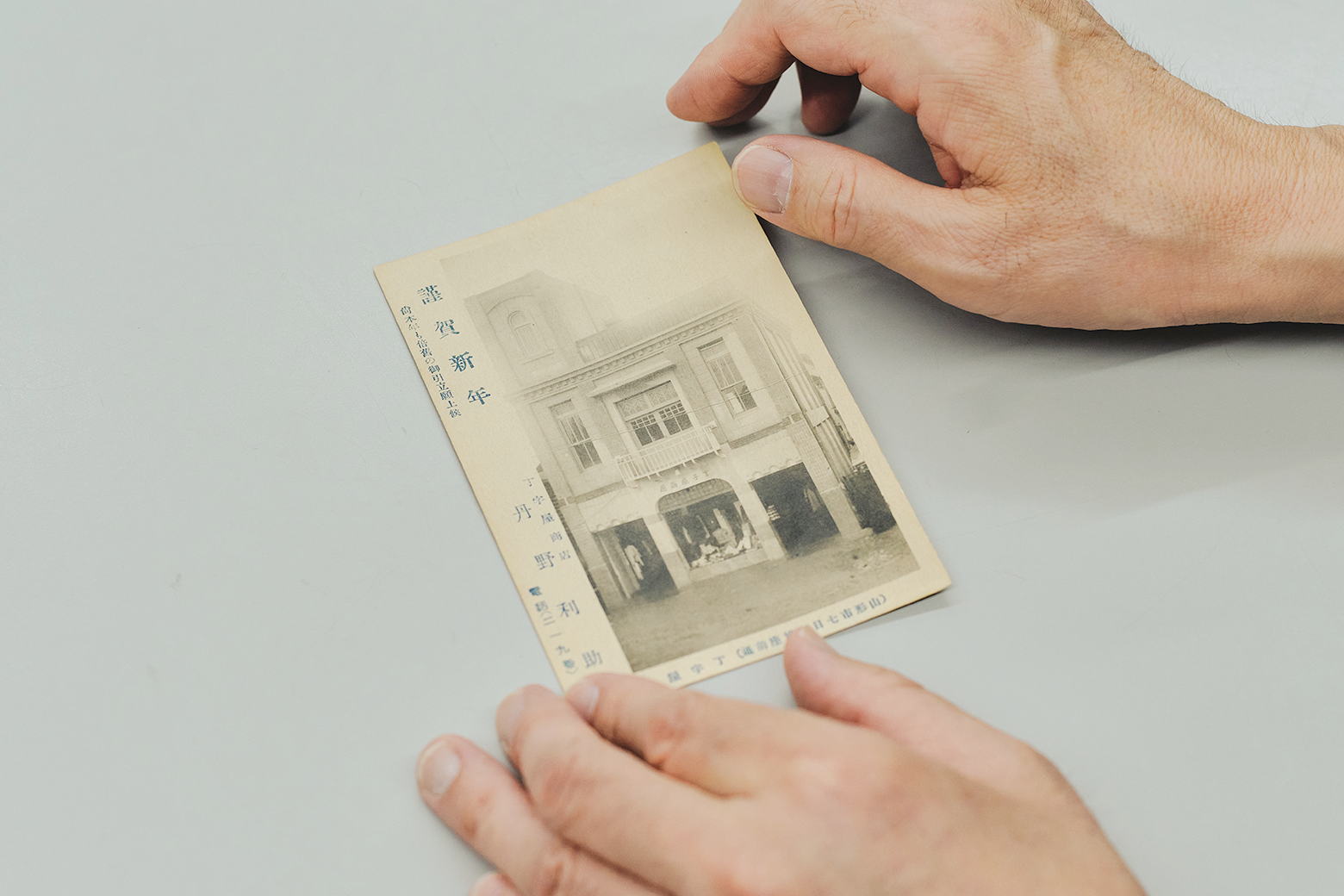 建設当時の姿をしのばせる一葉のはがきが残っている。洋品店創業者が、新店舗落成記念としてお得意さまに送った100年前の年賀状だ。