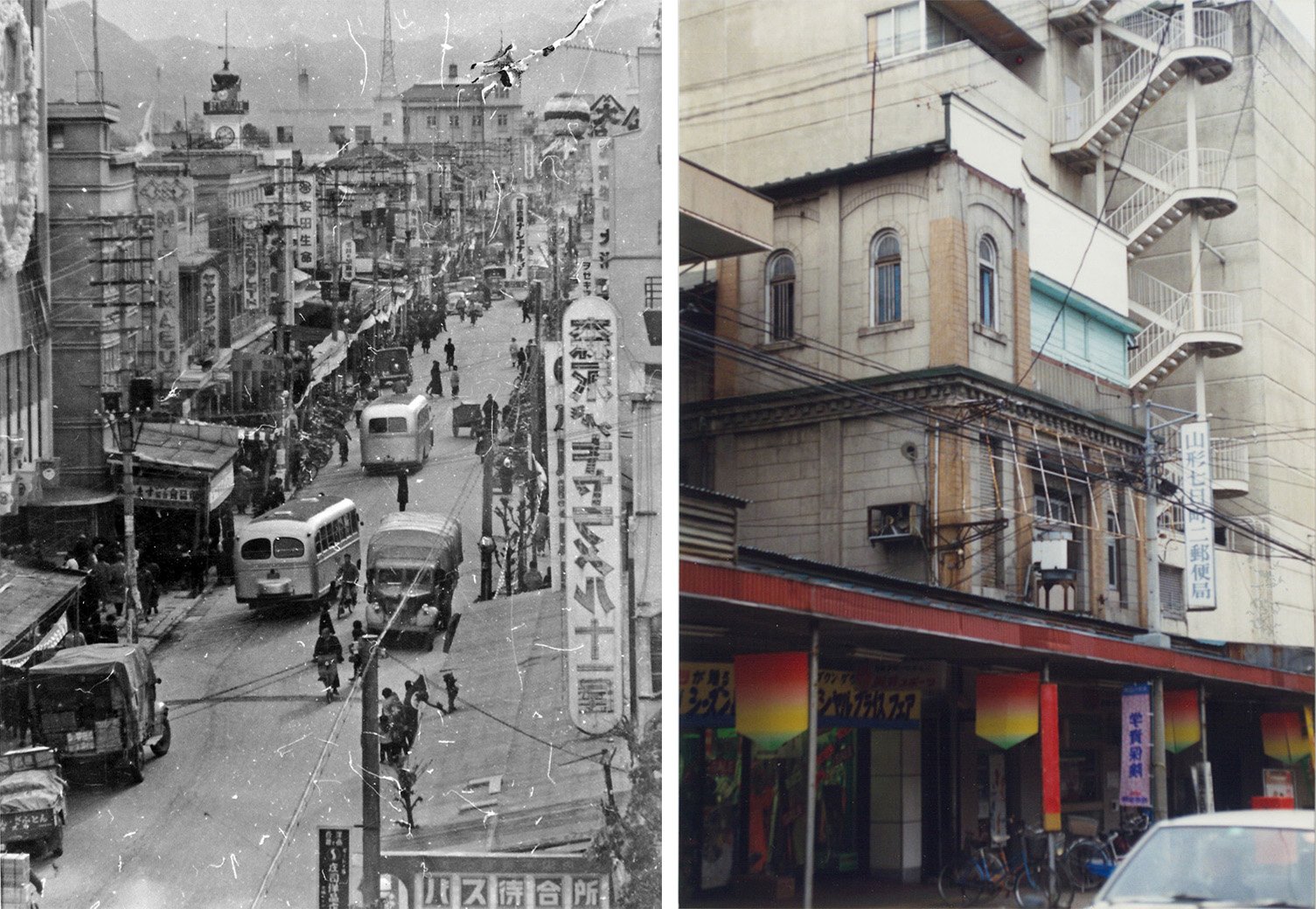 (右)1990年代初頭、アーケードがあったころの山形七日町二郵便局 山形県郷土館「文翔館」所蔵