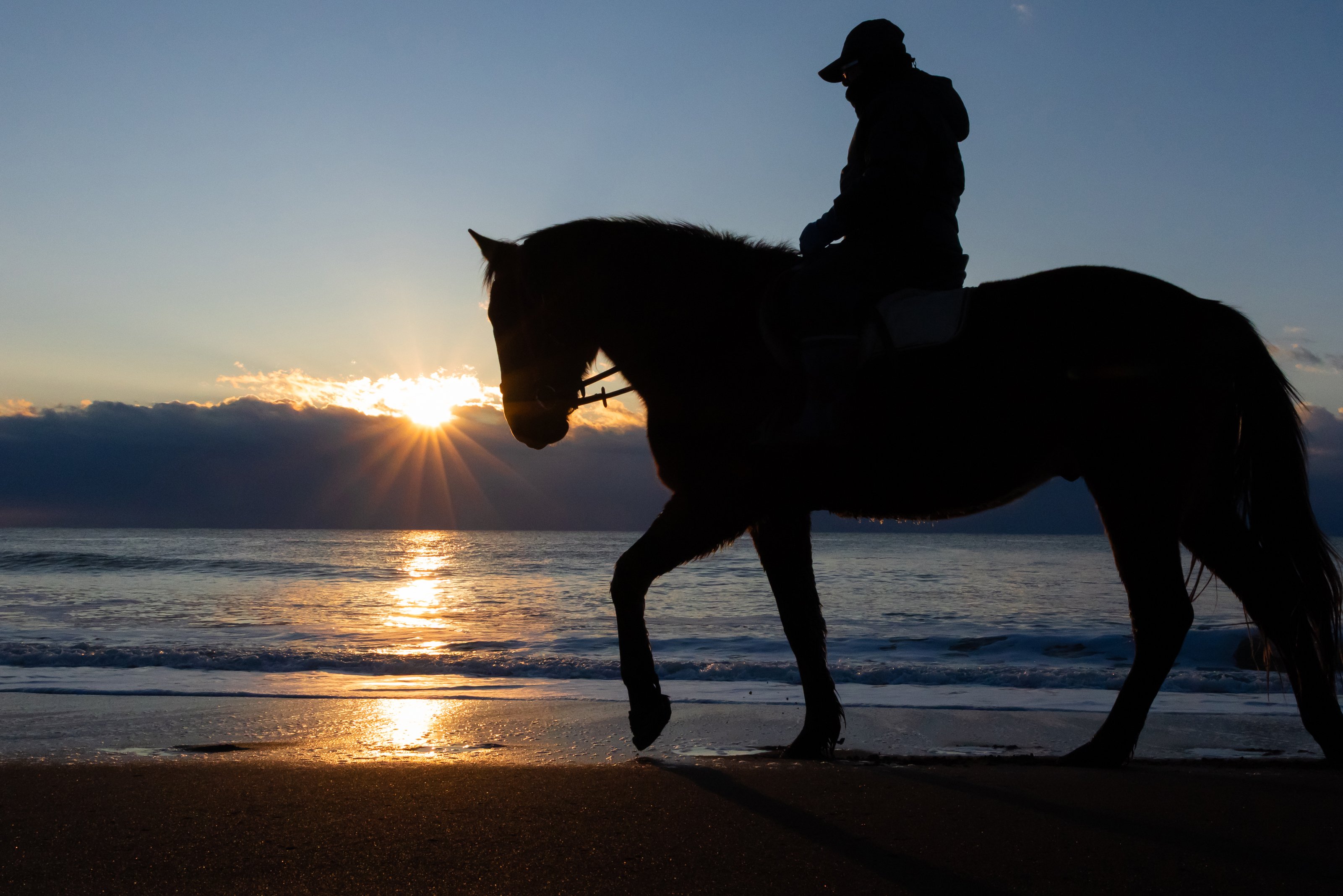 雲の向こうに確かな陽光を感じさせる空のもと、砂浜には波音と馬の足音だけが響き渡っています。その広大な風景に身を委ねる時間が、新しい年への期待を静かに膨らませてくれます。
