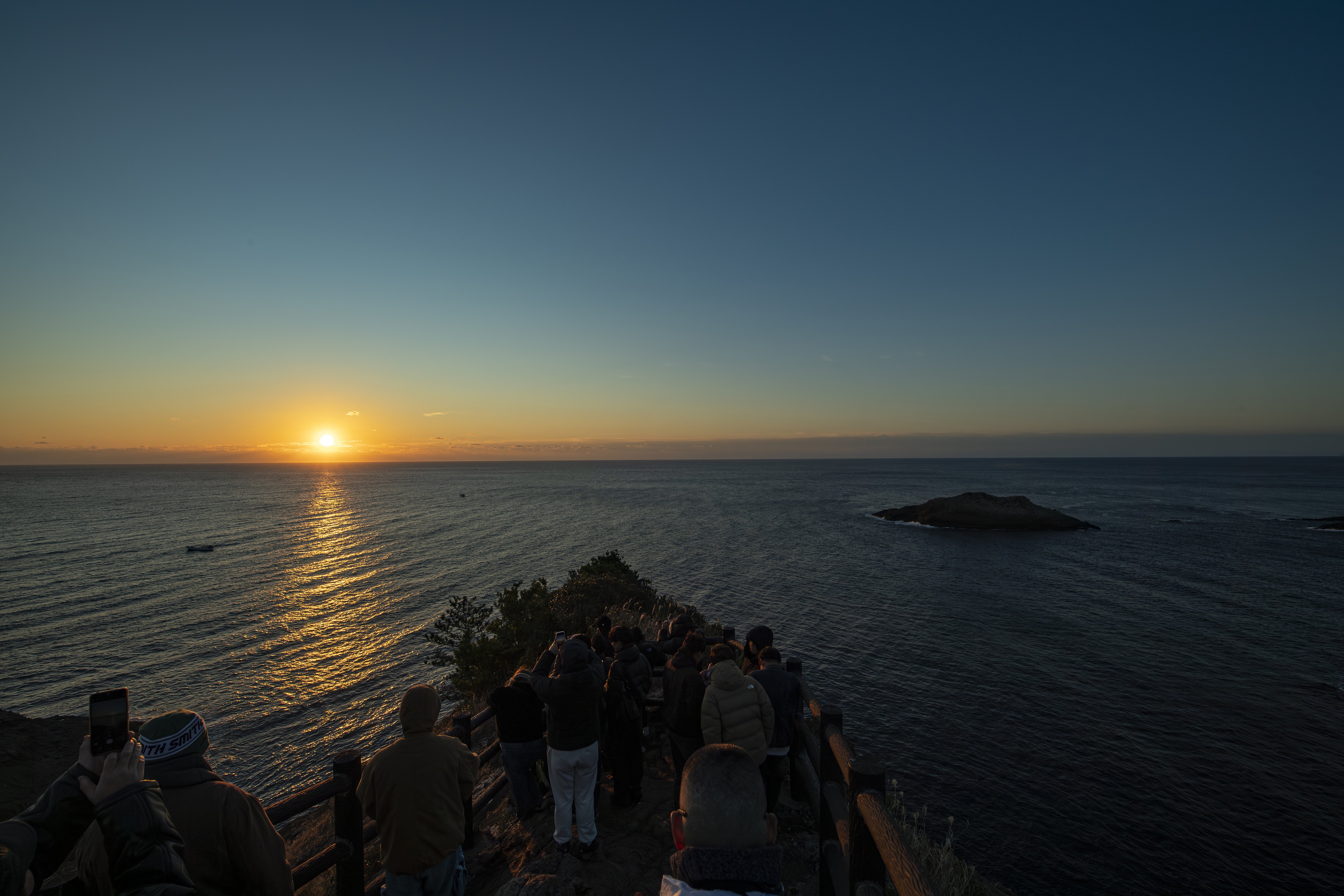 東の空が白み始めると、海はオレンジ色を帯び、断崖の陰影がくっきりと浮かび上がっていきます。爽やかな潮風に包まれながら迎えるこの朝が、"馬"の名を持つこの地らしい、午年の始まりをすがすがしく印象づけてくれました。