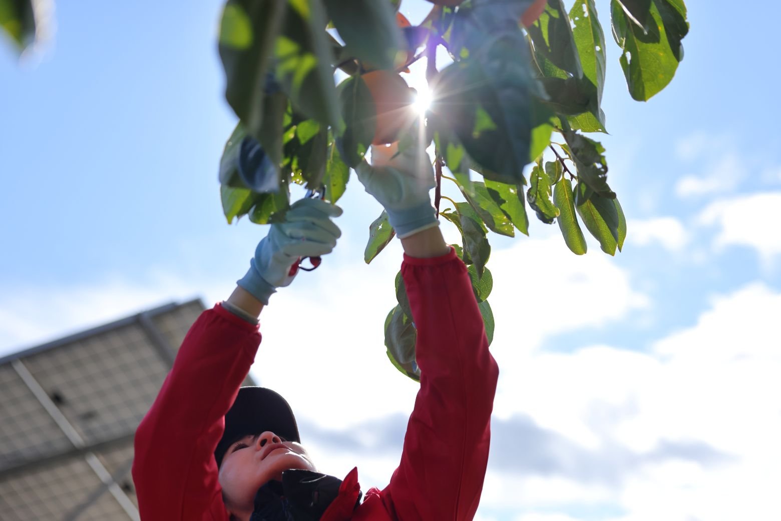 脚立や道具の安全な使い方を学んでから、はさみを手に収穫スタート。つややかな柿は濃く色づき、手にするとずっしりと重みを感じます。