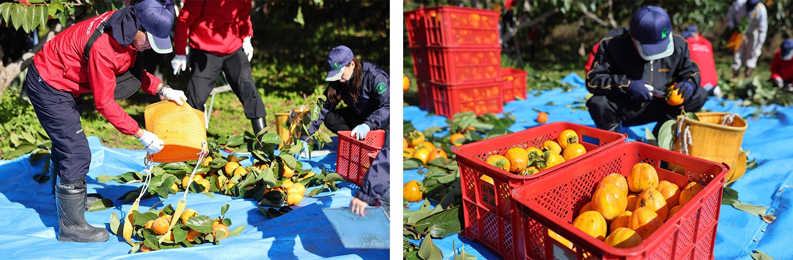 晴れ渡る青空のもと、参加者が集まったのは福島県伊達市にある柿農園です。地域の名産である「あんぽ柿」は、カタログ販売として取り扱いをしていることもあり、原材料となる柿の収穫体験を行うことになりました。