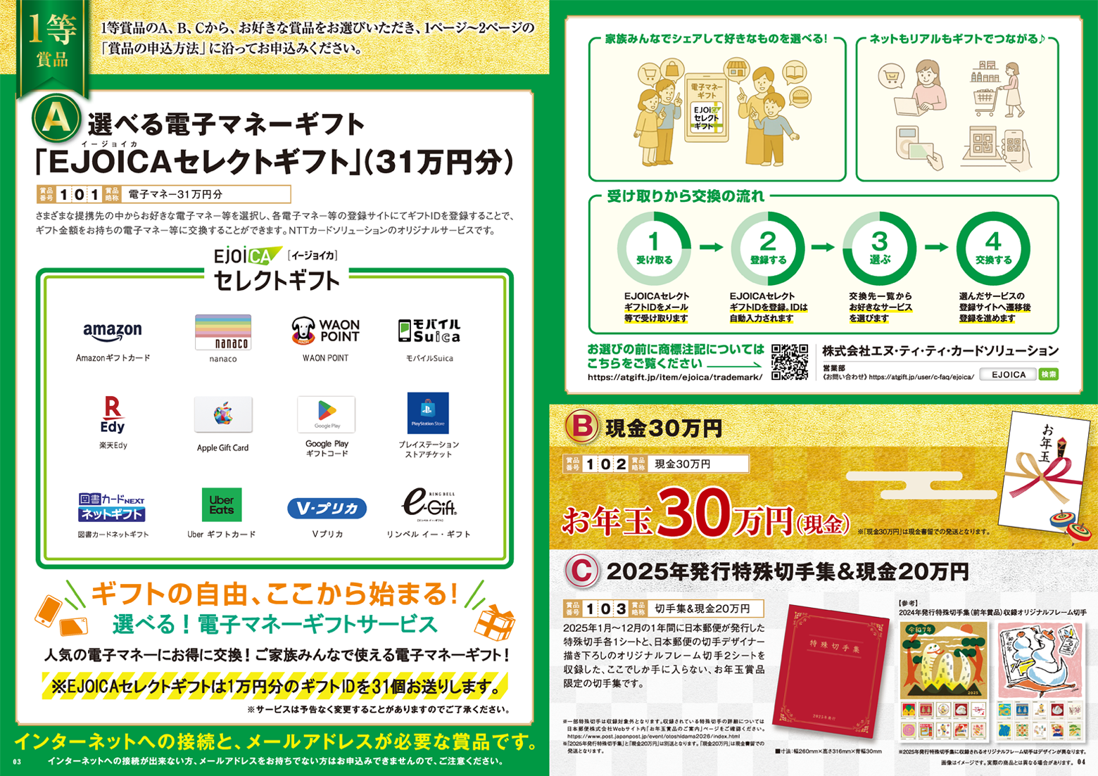 山尾:今年の1等賞品は、「現金30万円」「選べる電子マネーギフト31万円分」「2025年に発行した特殊切手集と現金20万円のセット」の3種類から一つをお選びいただけます。2等は「賞品カタログギフト」、3等は「お年玉切手シート」です。