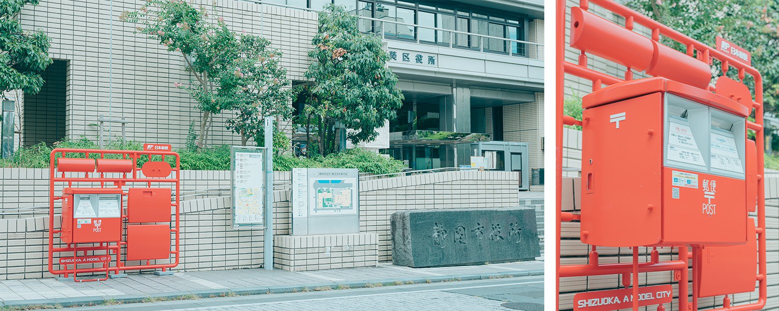 駅から10分ほど歩くと、静岡市役所 静岡庁舎新館の前に、よく見慣れたあの赤いオブジェが......。そう、これは「郵便ポストプラモニュメント」。郵便ポストが分解され、プラモデルのパーツのように配置されています。