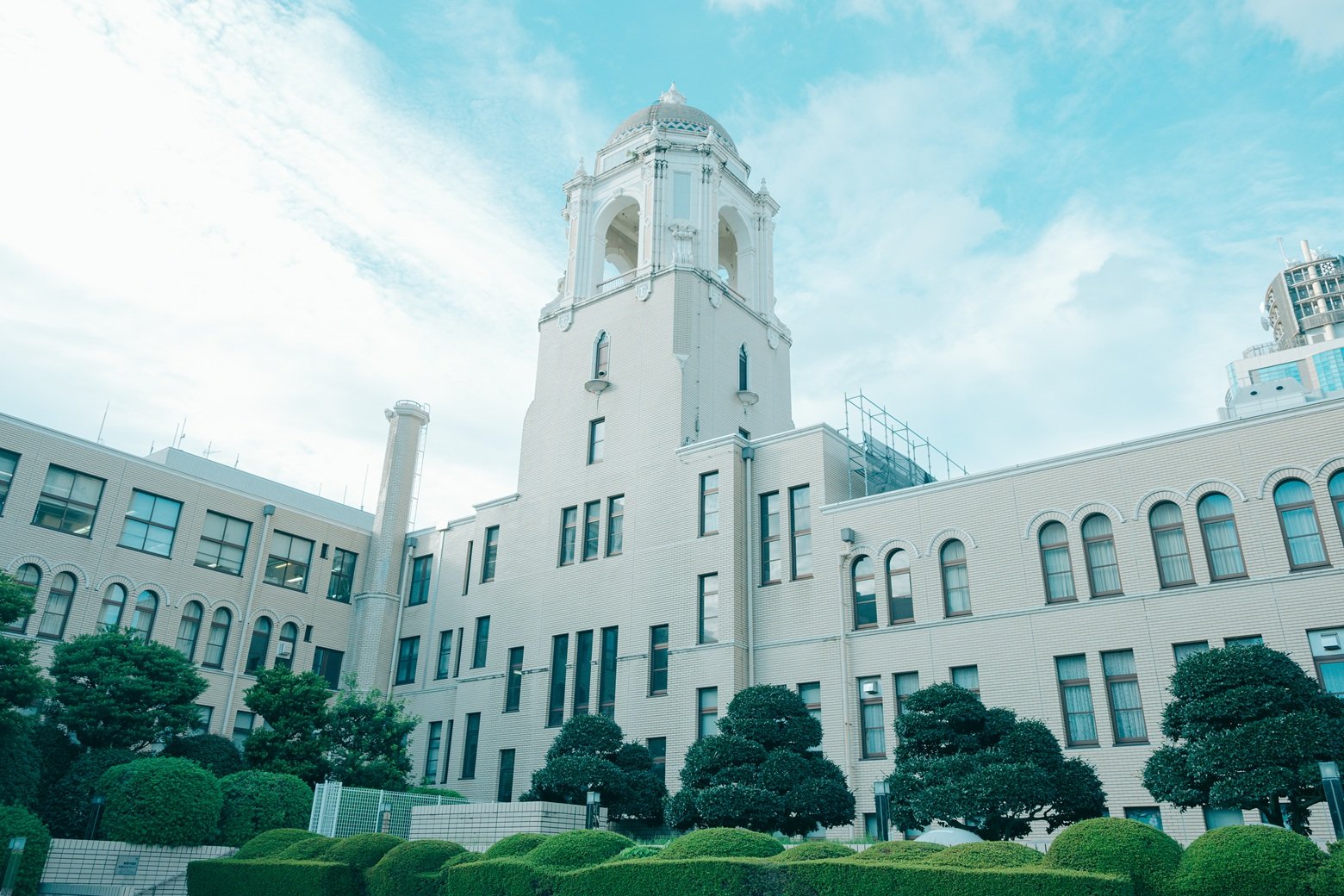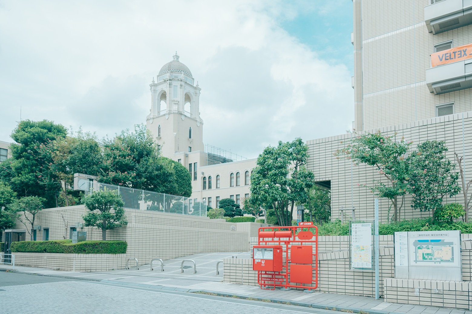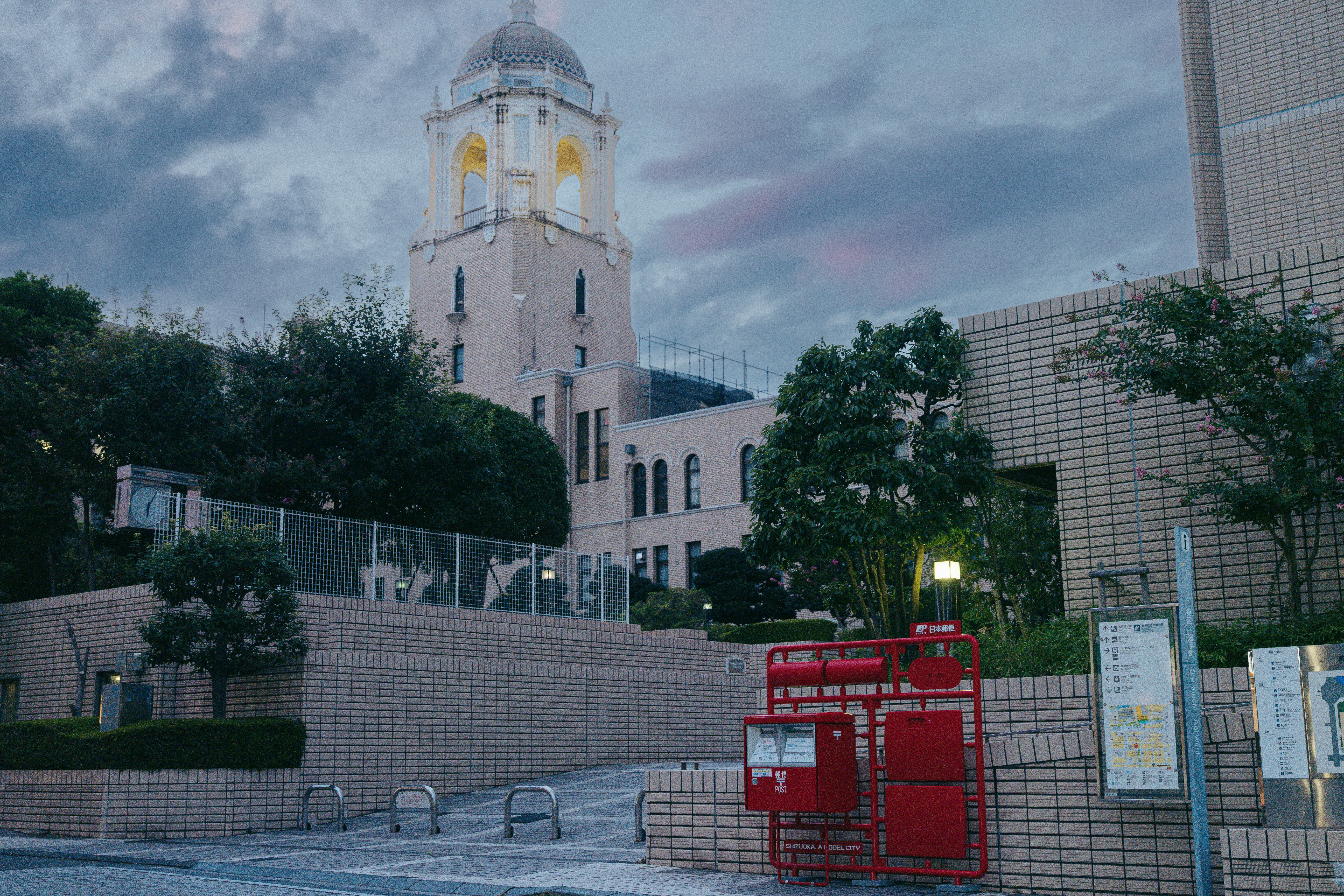 郵便ポストプラモニュメントのある静岡庁舎 新館の隣に立つのは、1934年竣工の静岡市役所 静岡庁舎本館。外壁が象牙のタイル張りであり、テラコッタが多用された4階建ての建物で、青いモザイクタイルのドームが印象的な街のシンボルです。