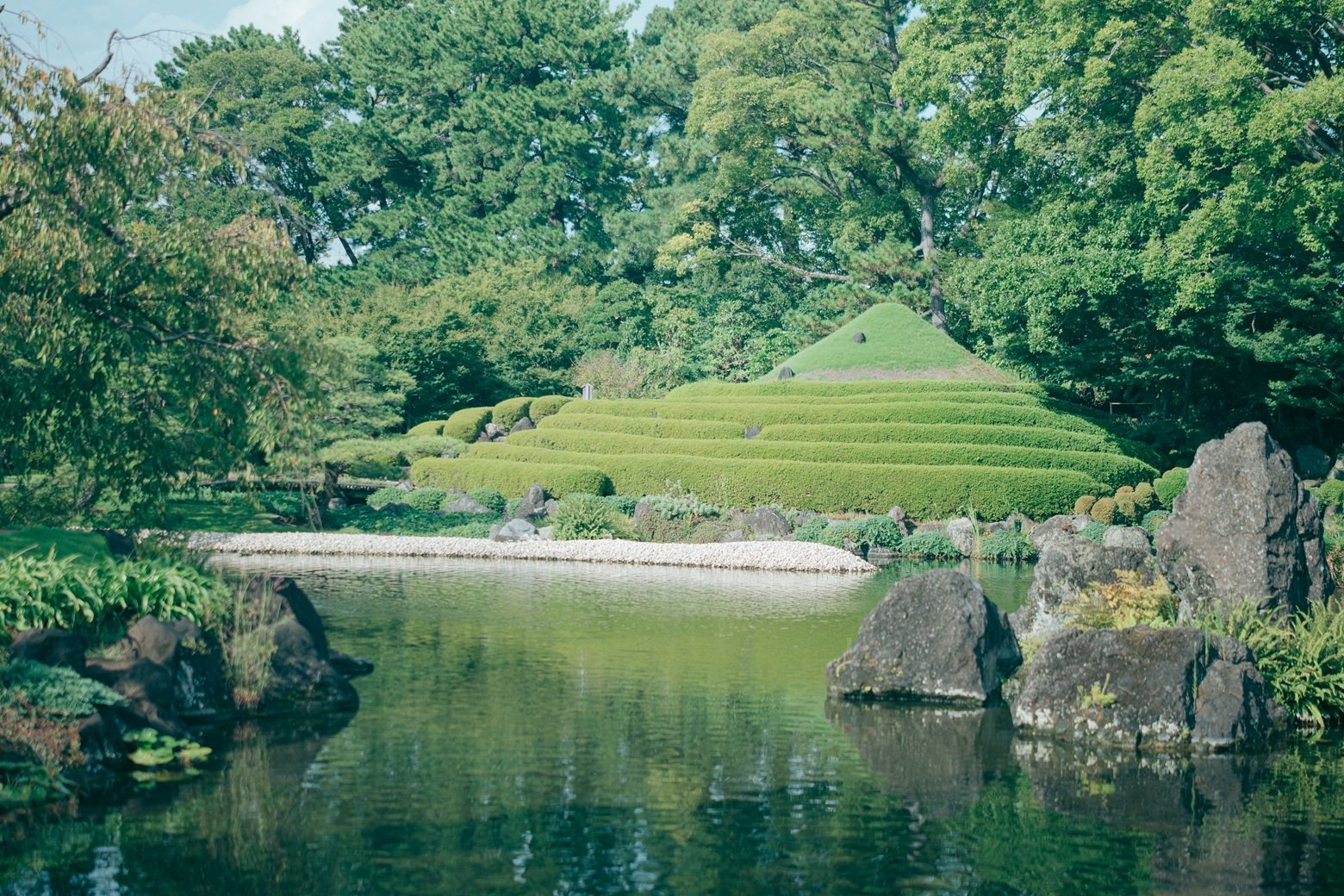 庭園には富士山に見立てた小山があり、小さな滝から池へと水が流れています。