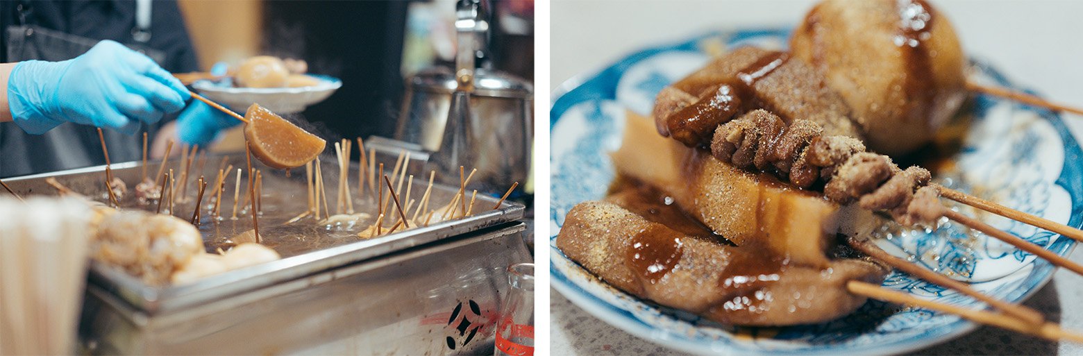 カウンターに並ぶのは、継ぎ足し続けた出汁(だし)で煮込まれた黒はんぺん・大根・白焼きなどのおでん。真っ黒に染まり見た目にはインパクトがあるものの、口にすると意外に優しい味わいです。煮干しやさばなどのふしを粉末にした「だし粉」も欠かせません。