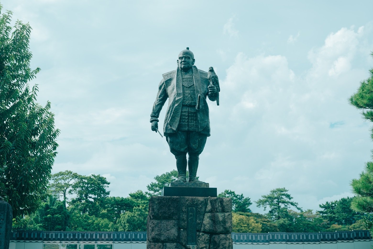 駿府城公園のなかを進むと、鷹を腕に乗せた徳川家康の銅像が立っていました。高さ6.5mとずいぶん大きく威厳があるその姿は晩年のもの。