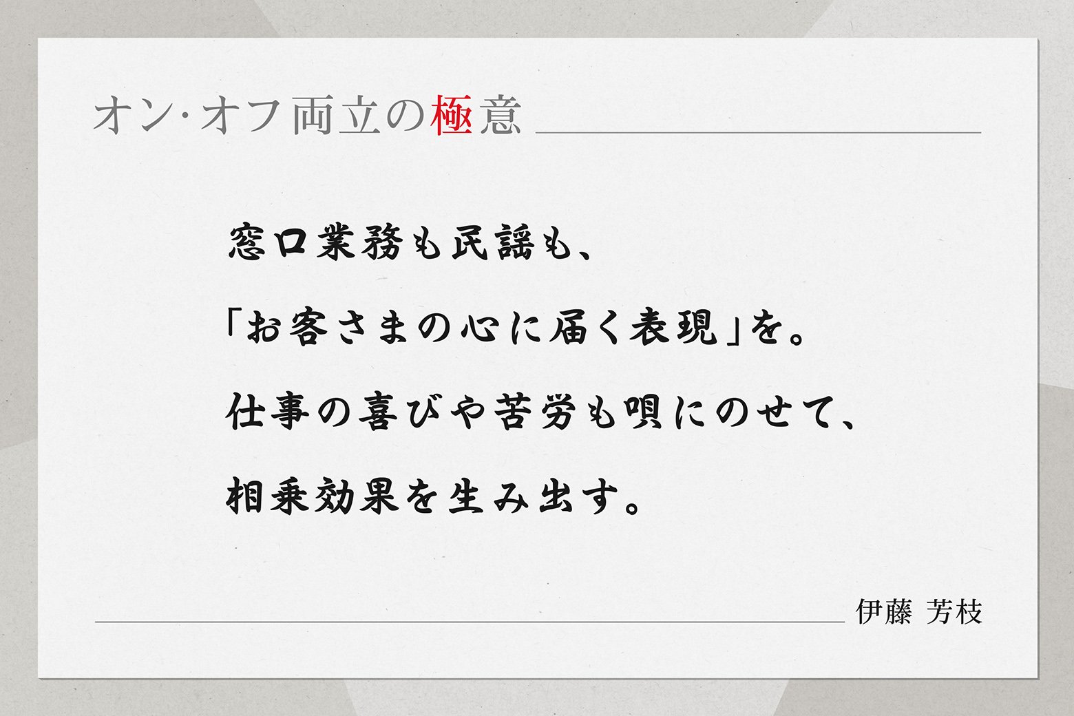 伊藤:民謡で「どうやって表現したら(聞き手の)心に響くのか」を考えることと、仕事でお客さまに対して「どうやってお声かけしたら(お客さまの)お役に立てるのか」を追求することは、私のなかで共通しています。