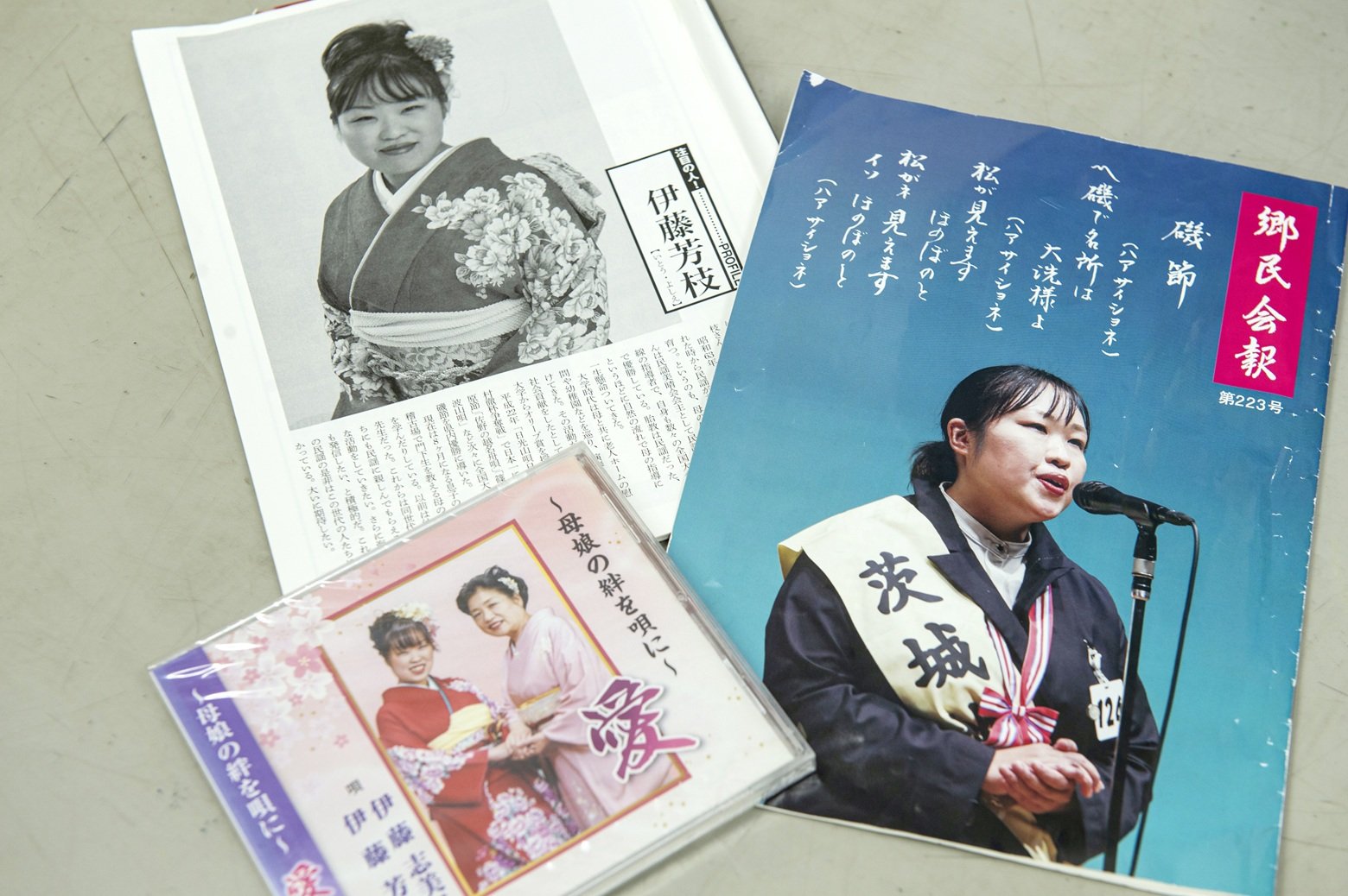 伊藤:茨城県の郷土民謡「磯節(いそぶし)」の第39回全国大会ですね。磯節は、北海道の「江差追分(えさしおいわけ)」、福岡県の「博多節(はかたぶし)」と並ぶ日本三大民謡の一つとされています。出身地ということもあり、私は幼いころからこの唄に親しんできて、18歳から毎年この大会に出場していましたが、ある年は決勝で負けてしまったり、ある年は予選敗退となってしまったりなど、心が折れそうになるような経験をしてきました。それでも挑戦を続け、出場11年目の、第39回大会でついに優勝。「本当に私が?」と思うほど、信じられないうれしさだったことを覚えています。同時に身が引き締まり、これからも頑張ろうと思いました。