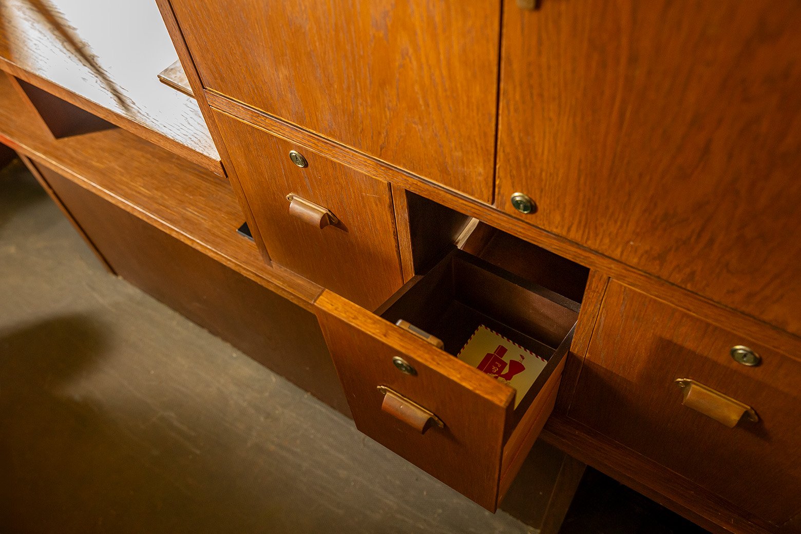 また、横の跳ね上げ扉を開けると現れる窓口と、その奥に見える内装は、アンティークな書斎をイメージして仕上げています。