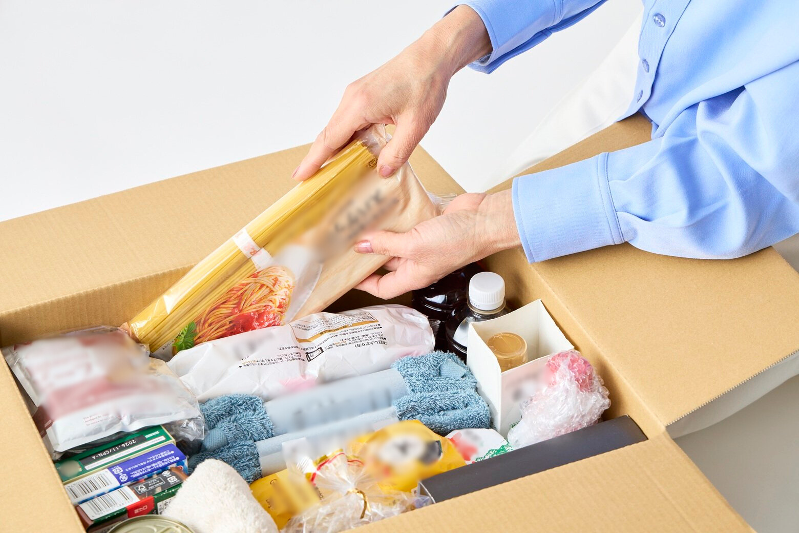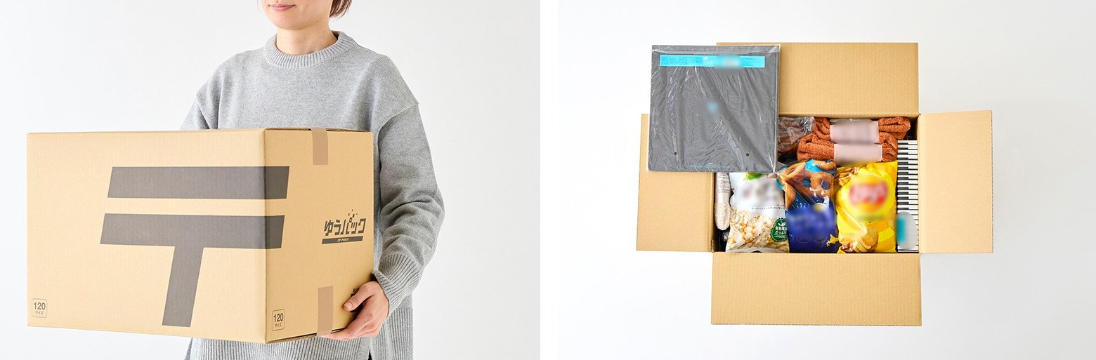 今回検証するのは、「仕送り」と「引越し」という、利用シーンの多い2パターン。離れている家族へ送ったり、引越しの最終日に最後に残った生活小物を新居へまとめて送るという状況を想定し、食品と衣類・雑貨などを用意しました。郵便局で販売している「ゆうパック」の箱(60、80、100、120サイズ)に、いったいどれくらいのものが入るのか。整理収納アドバイザーの井田さんに、実際に詰めてもらいました!