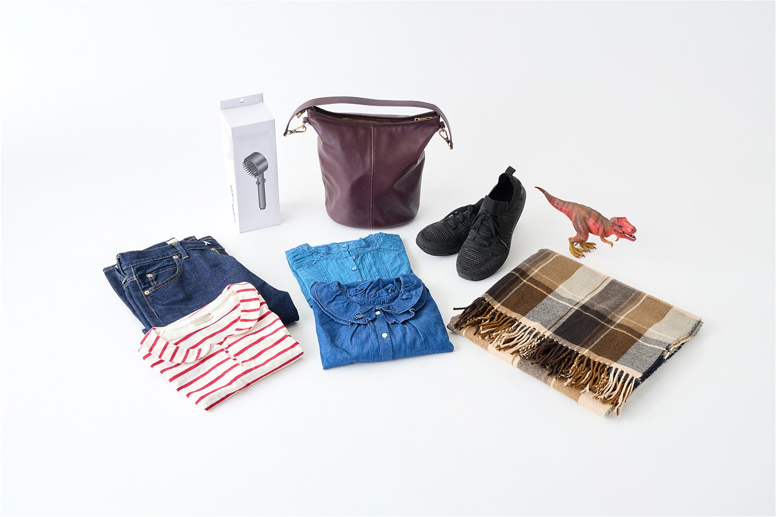 80サイズになると、入れられるアイテムの種類がグンとUP。バッグやデニム、箱入りのシャワーヘッドなど、かさばるものも入ります。横サイズが350mmなので、荷造り後でも持ち運びしやすいサイズ感です。