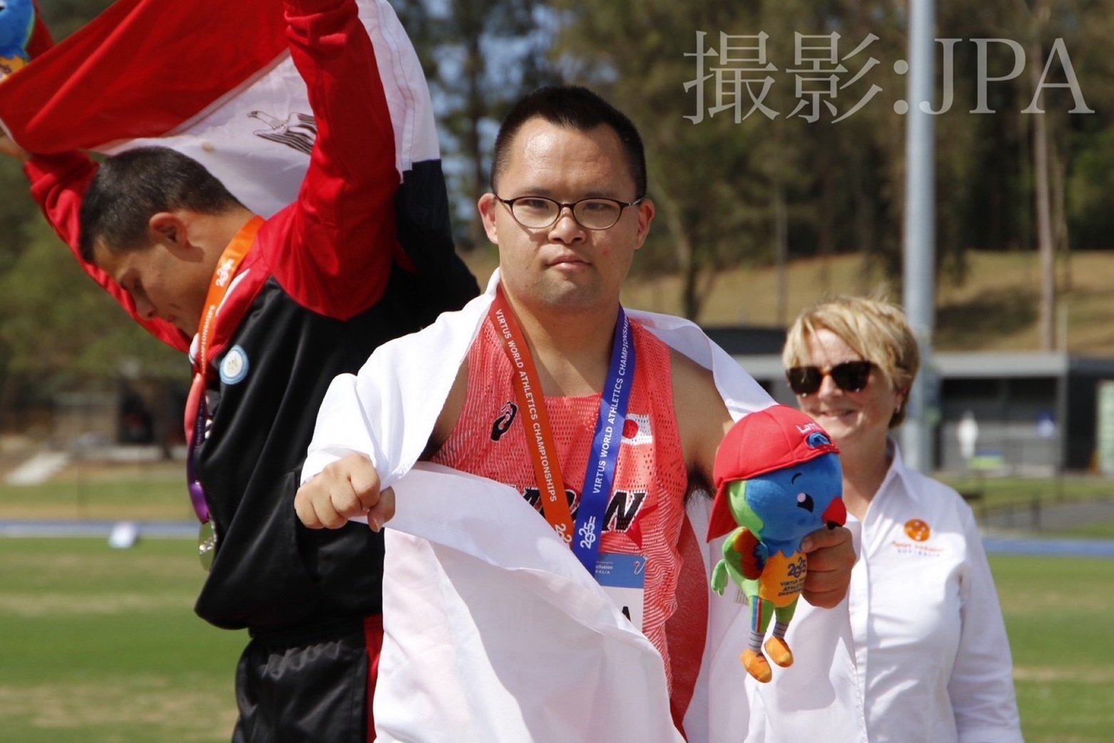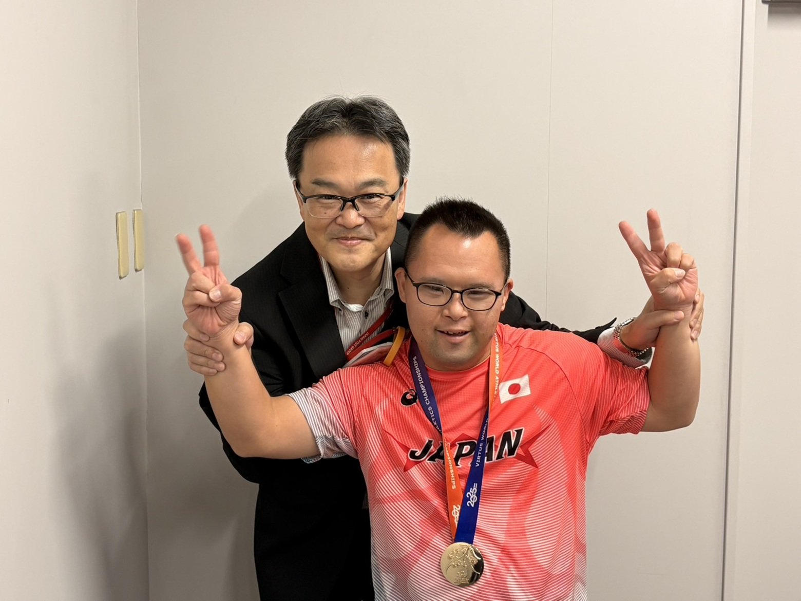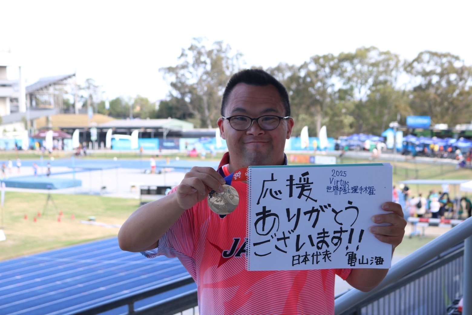 亀山:ありがとうございます! 自分が持っていたこれまでの世界記録(30.02m)よりも遠くに投げられて、うれしかったです。いっしょにオーストラリアに行った家族もガッツポーズをして喜んでくれました。郵便局でもチャレンジドルームの指導コーチや仲間たちから、「世界一すごいね!」「おめでとう!」と言ってもらったり、局内に写真を飾ってもらったりしました。あと、江戸川区の区長さんに金メダルを見せたらとても喜んでくれました。