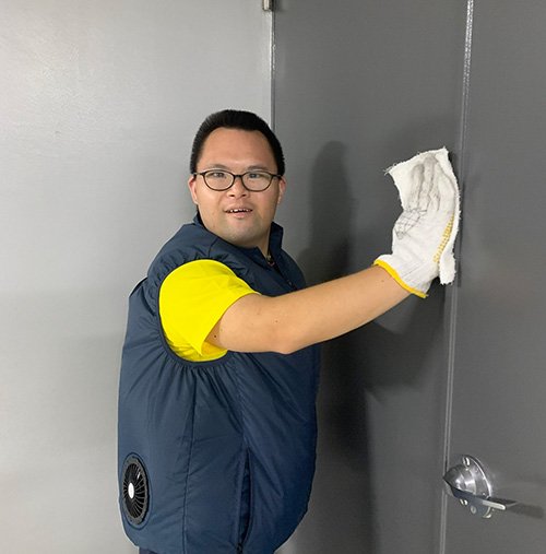 亀山:芝郵便局内の清掃です。2人の指導コーチのもとで、私を含めて4人のスタッフが、床のモップがけや壁の雑巾がけをしています。台車が通った跡などもきれいにしています。