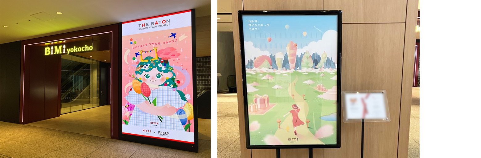 大村:KITTE名古屋では、地域との連携企画や、産学連携施策を積極的に取り組んできました。その一つが、「THE BATON PROJECT」です。これはイラストレーターの方々にシーズンごとのポスターを制作いただく取り組みですが、2022年より地域の美術系大学の学生さんにも参加いただいています。学生さんの作品を館内に展示することで、日常的に利用されるオフィスワーカーだけでなく、若年層の方々にも施設に親しみを持っていただくきっかけになればと考えています。学校を卒業して10年、20年後も、昔ここに作品が展示されていたんだと思い出話をしながら帰ってくるような場所になったらいいですね。